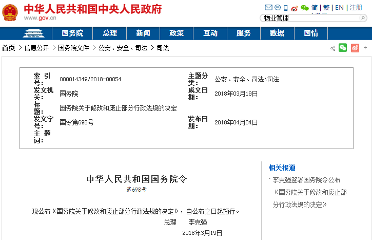《物業管理條例》列為決定修改的行政法規。修改的內容為: